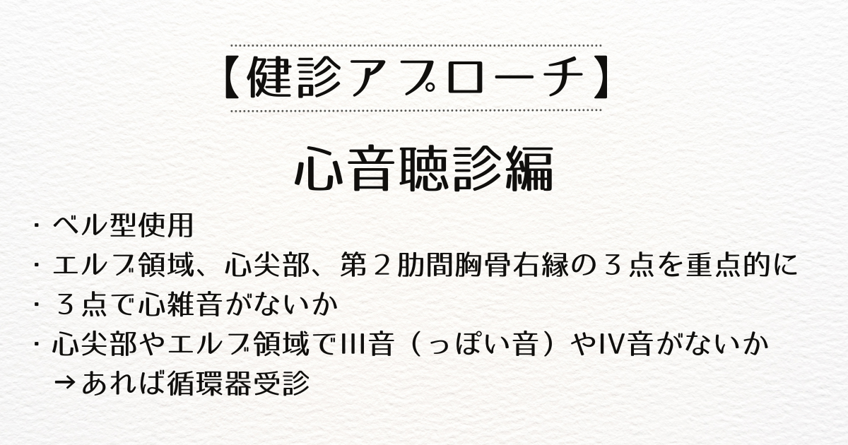 ・聴診イメージとしては、3点で心雑音がないか、エルブ領域や心尖部でIII音(っぽい音)やIV音がないか→あれば循環器受診